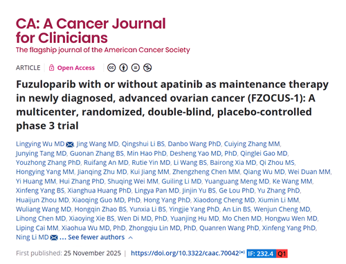 2025年11月25日,永利娱乐城医药自主研发的创新药氟唑帕利联合阿帕替尼或氟唑帕利单药用于新诊断晚期卵巢癌(OC)的一线维持治疗研究最新数据(FZOCUS-1研究)重磅在线发表于国际顶尖医学期刊《临床医师癌症杂志》(A Cancer Journal for Clinicians,简称CA,2024年影响因子高达232.4)1。